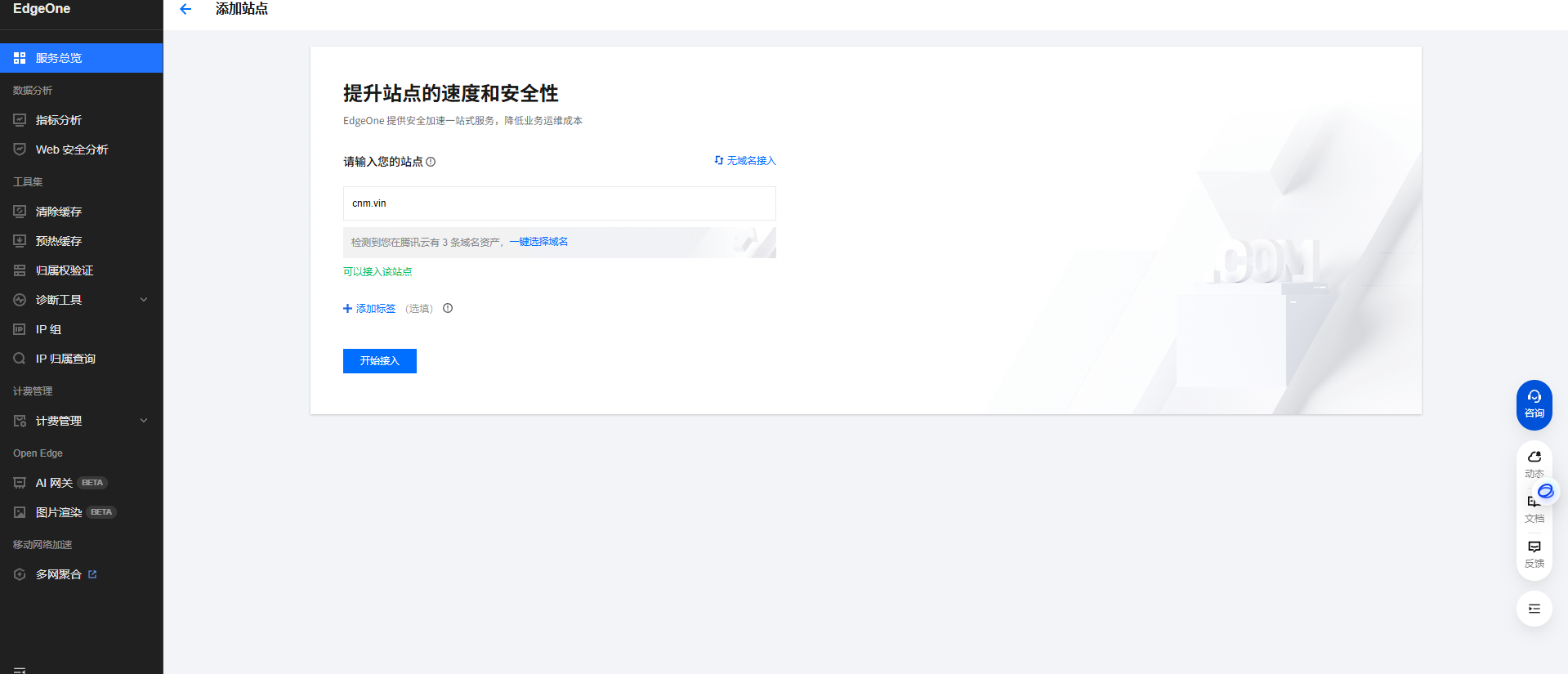 默认情况下,EdgeOne 接入要求您使用当前业务的二级域名作为站点名称接入,在站点输入框中,输入准备好的待接入站点域名,例如:lik.cc。单击开始接入。
