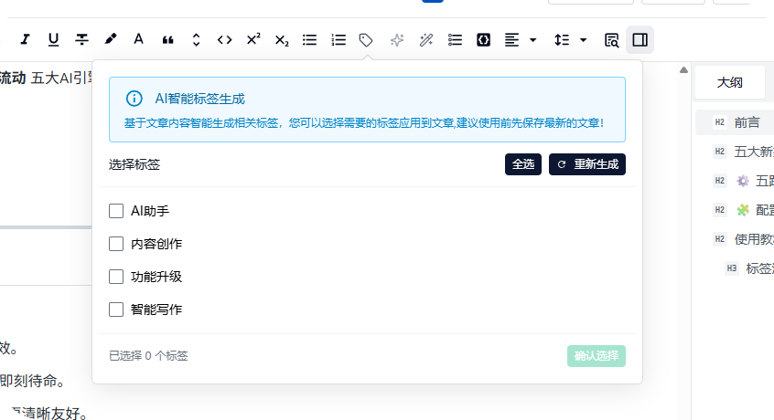当我们点击“生成标签”按钮,系统将自动创建标签,并将所选标签注入至文章内容中!