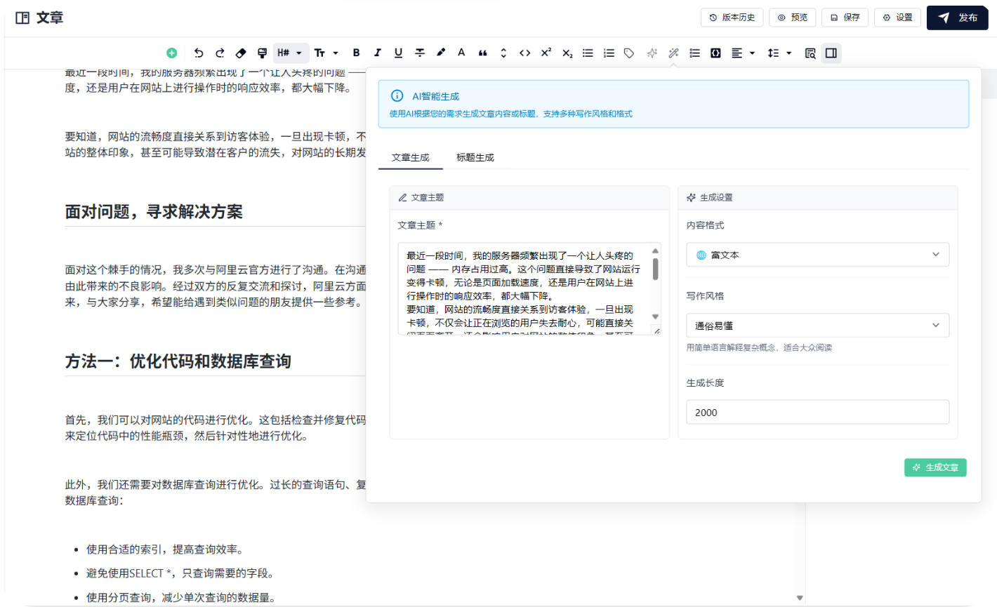 自动注入文章页:无需手动配置,打开编辑页面,AI 助手即刻待命。