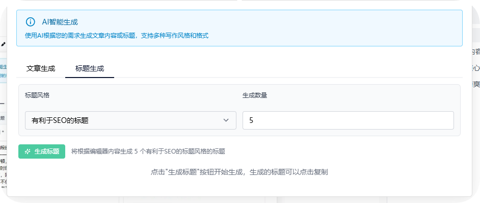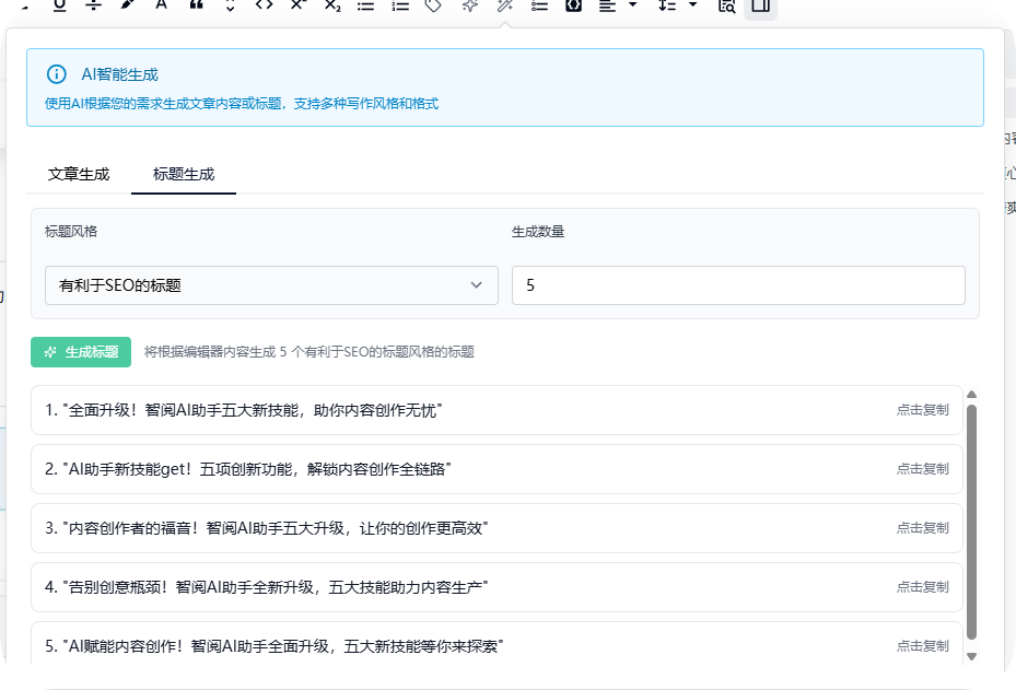 完成文章创作后,若不知如何拟定标题,我们可以借助AI一键生成引人注目的标题。